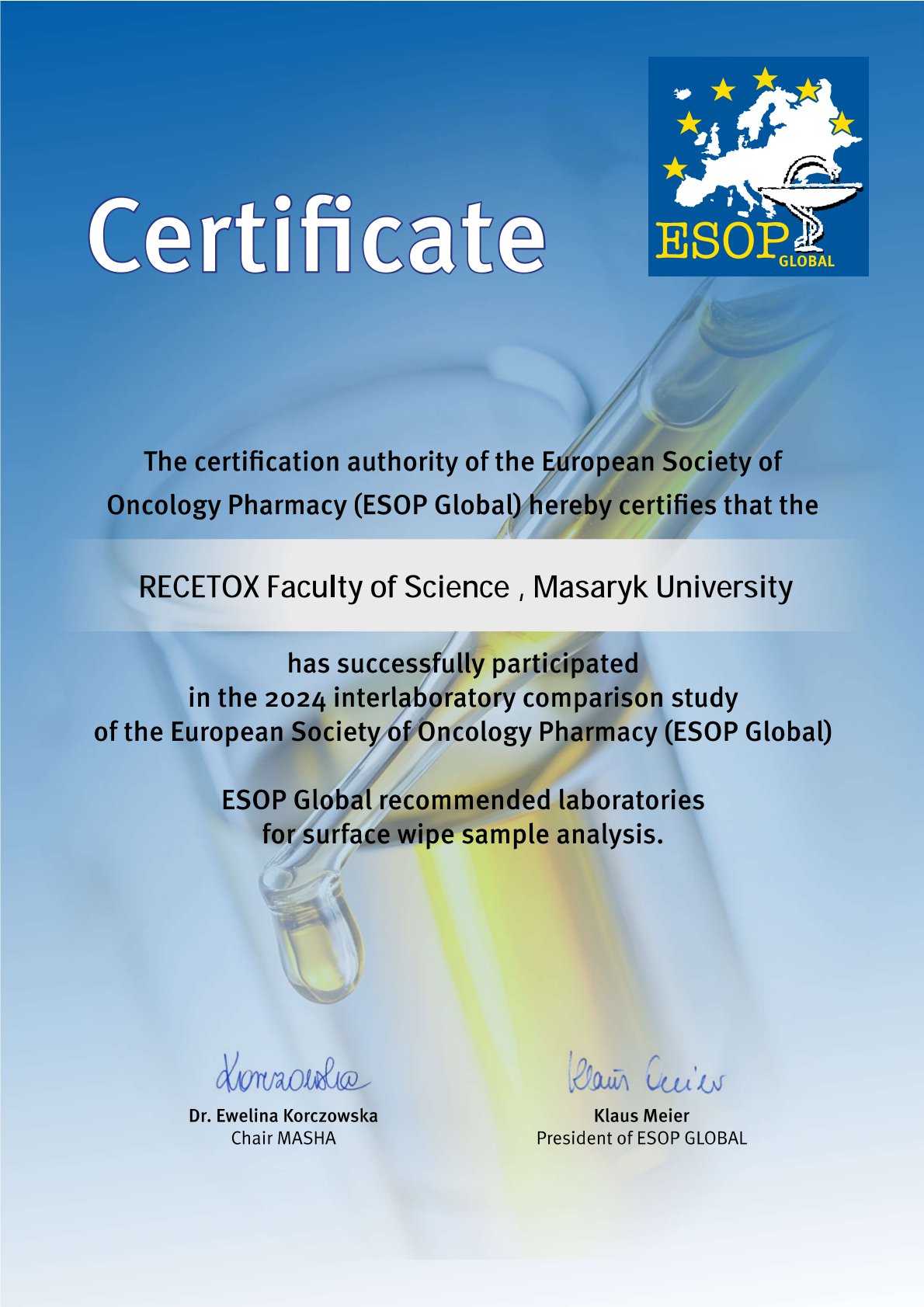 Laboratoře RECETOX získaly „Certifikát European Society of Oncology Pharmacy (ESOP Global)”
